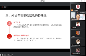 门博士的讲座首先对思政课程与课程思政的概念进行区分,他指出二者有机结合的发展方向是时代发展的必然要求,立德树人不仅是思政课程要重视和强调的,也是其他有所课程需要落实的。外语课程思政就是要把价值观引领与语言知识的传授和语言应用能力的培养有机结合起来。外语课程思政建设的关键,在于教师转变教育观念,一名合格的教师不仅需要具备专业知识和熟练的语言技能,而且需要认识到课程思政建设的重要性并努力探索怎样在教学的整个过程中实施课程思政才能真正达到立德树人的教育目的。他从教学和育人两个层面回答“为谁培养人”“培养什么样的人”“怎样培养人”等问题。同时结合具体英语教材中的实例进行课程思政角度剖析。