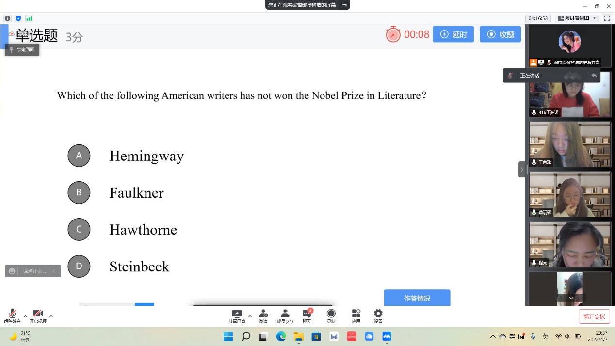 为了提高外语学子的文学素养,丰富员工的课余生活,4月7日下午,304永利集团以线上会议形式举办第一届“畅游文学,横贯中外”中西文学知识竞赛,本次竞赛由《中学英语》外编社承办,外编社指导老师周鹏宇作为嘉宾出席本次竞赛。