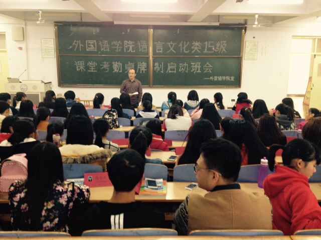 经过一周的准备,304永利集团语言文化类专业15级四个班11月2日中午在开发区综合楼312教室举行课堂考勤桌牌制的启动班会,全体108名同学参会,并将统一制作的桌牌摆在桌面上蓄势待命。