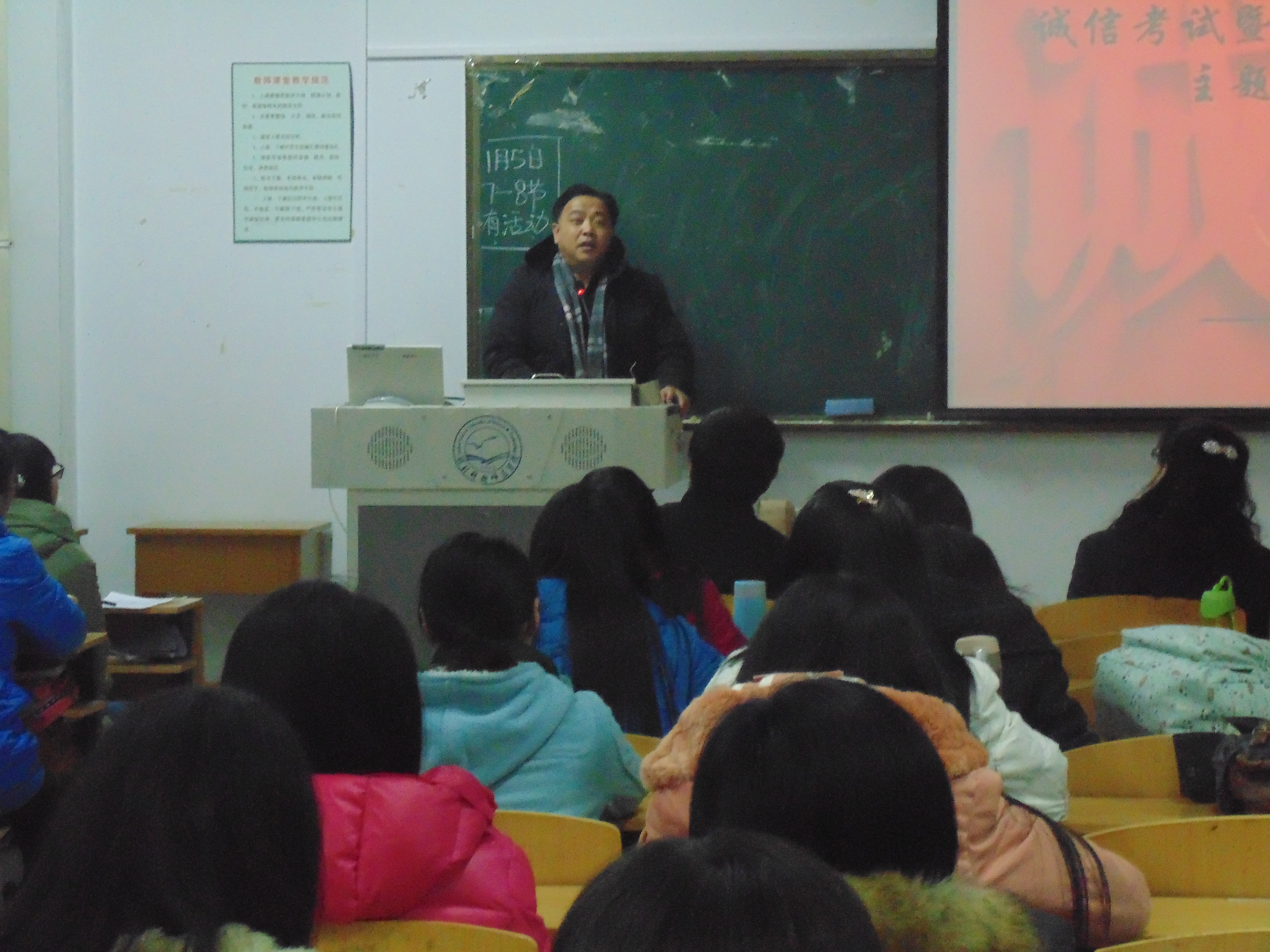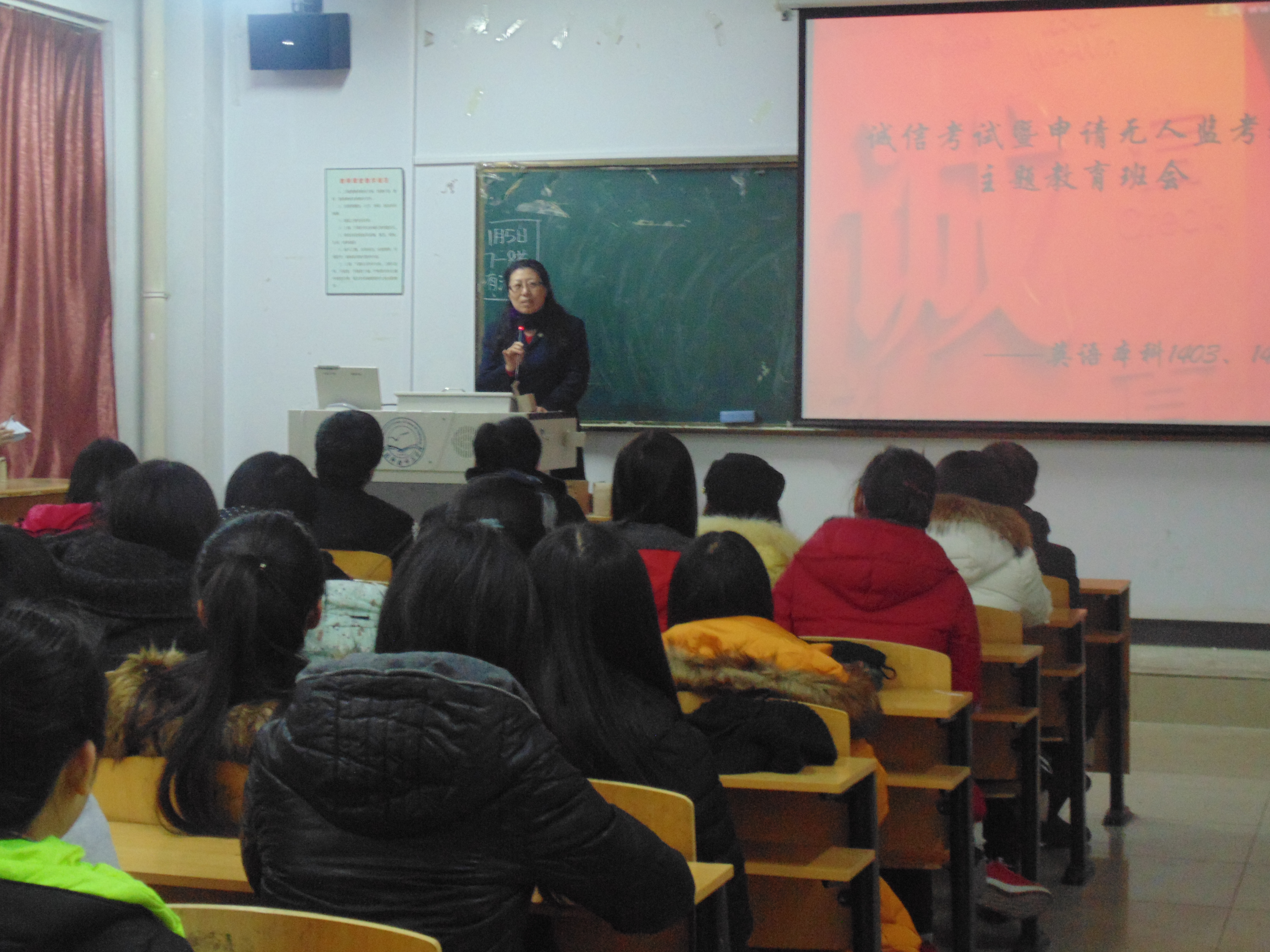 为了落实和响应公司关于开展“三风”专项建设和老员工文明养成主题教育实践活动的号召,充分发挥员工在学风考风建设和文明养成活动中的主体作用,在期末考试即将来临之际,304永利集团英语本科1403、1404班于1月5日在开发区校区综合楼711教室召开诚信考试暨申请无人监考班主题教育班会。外国语公司党委书记白雪松、经理邵丽君、学工办老师、校区员工组织代表等师生参加了班会。
