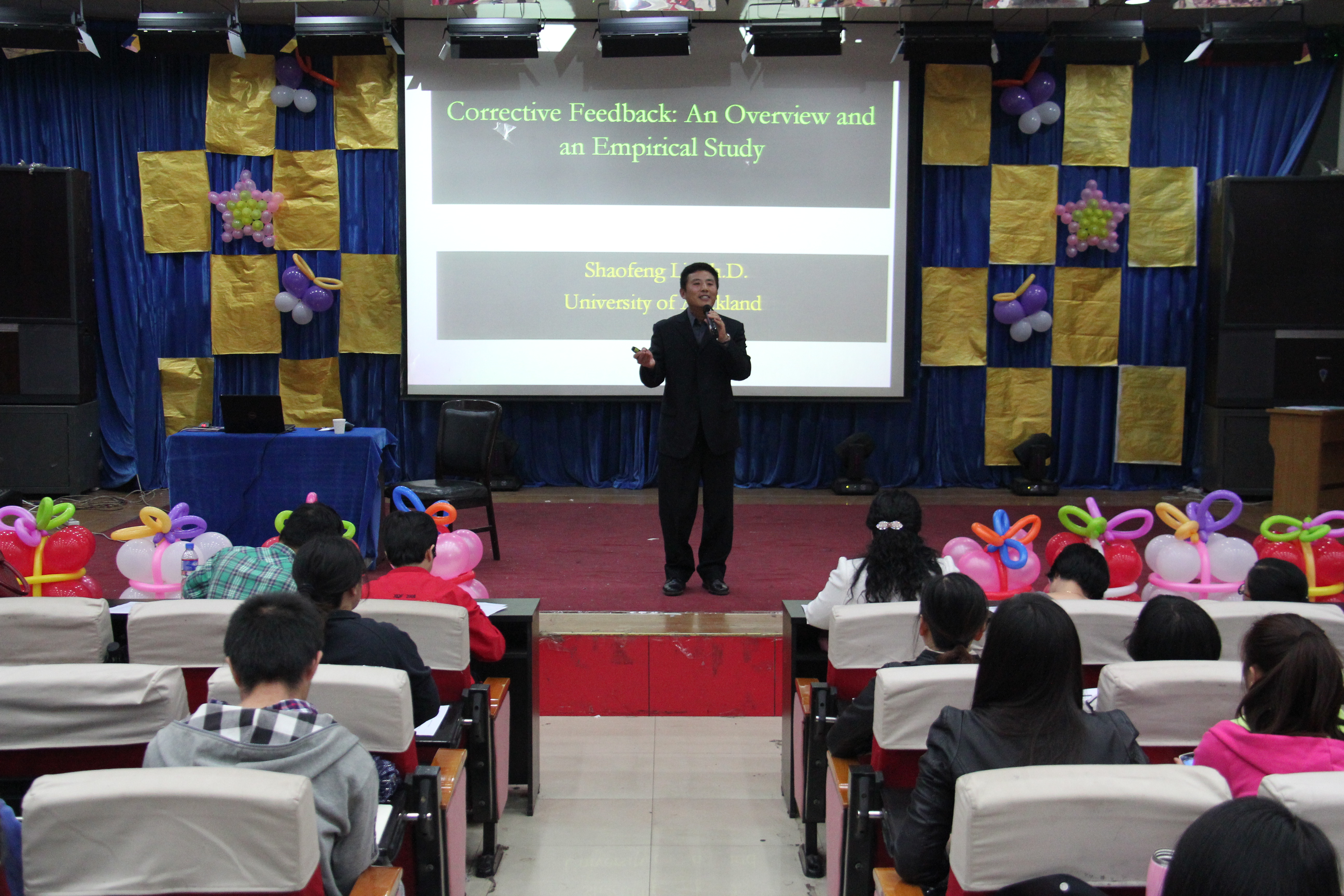 报告就纠正性反馈的分类、影响反馈策略的因素、纠正性反馈在任务教学法中的应用及实验研究等问题做了深入剖析。李少峰博士用简单的英语将复杂的学术问题讲解的浅显易懂,深入浅出,语言生动,广大师生听的津津有味,受益匪浅。