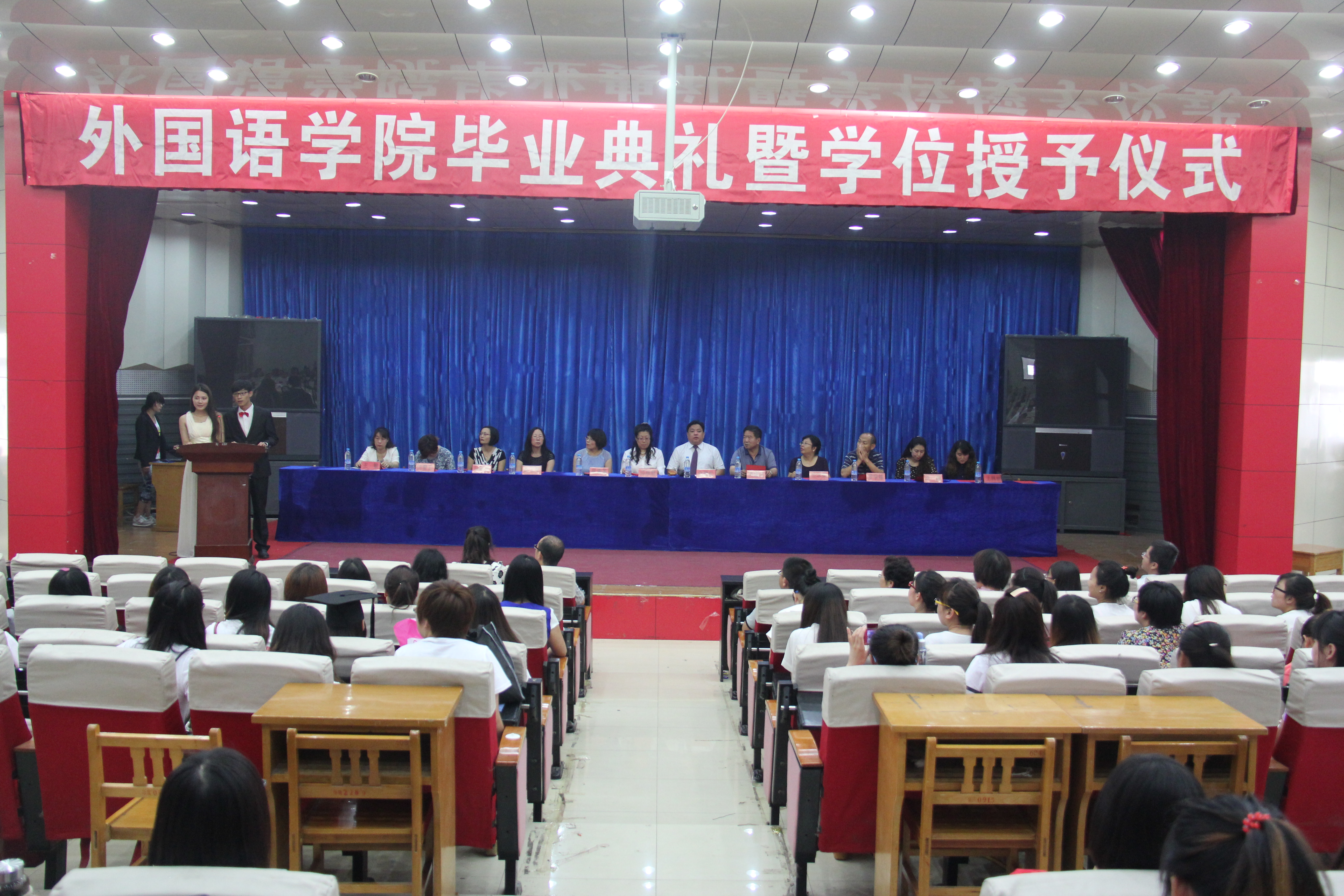 2014年6月17日上午,2014届毕业典礼暨本科生学位授予仪式在开发区学术报告厅隆重举行。外国语公司党委书记白雪松,经理邵丽君,副经理游建民、副经理崔海英以及各教学部主任和全体老师出席大会。即将学成毕业的309名2014届毕业生们满怀激动心情齐聚一堂参加了隆重而庄严的毕业典礼。