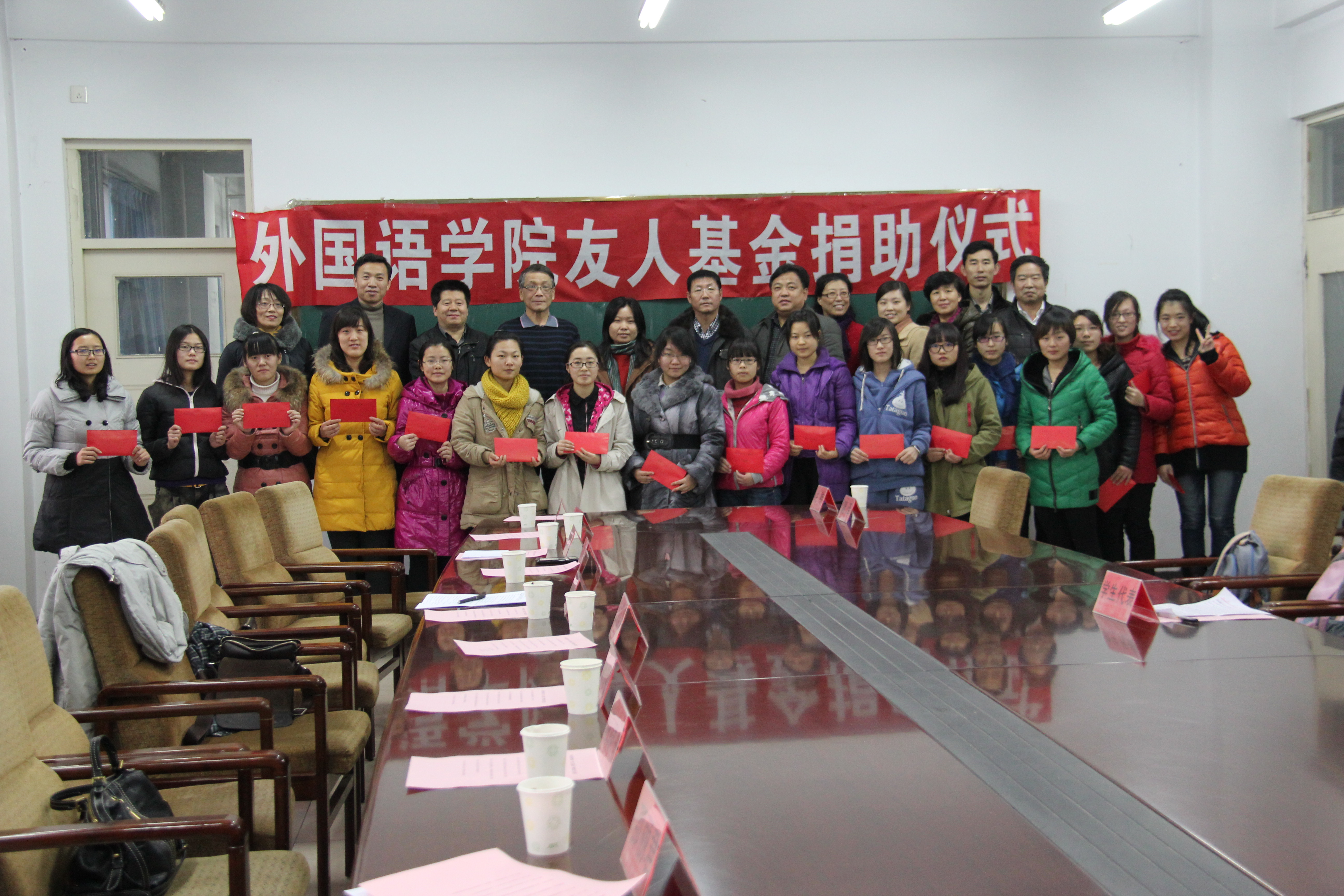 2013年12月24日下午,304永利集团友人基金捐资助学仪式在开发区校区一楼会议室举行,副董事长张福喜、员工处处长冯瑞银、宣传部副部长赵建平、员工处副处长宋文华、校团委书记于海印、外国语公司党委书记白雪松、经理邵丽君、副经理游建民和副经理崔海英等领导参加了此次活动,捐助仪式由304永利集团学工办主任田辉老师主持。此次捐助活动共募集人民币近九万元,募集资金全部资助给304永利集团17名品学兼优的特困生。