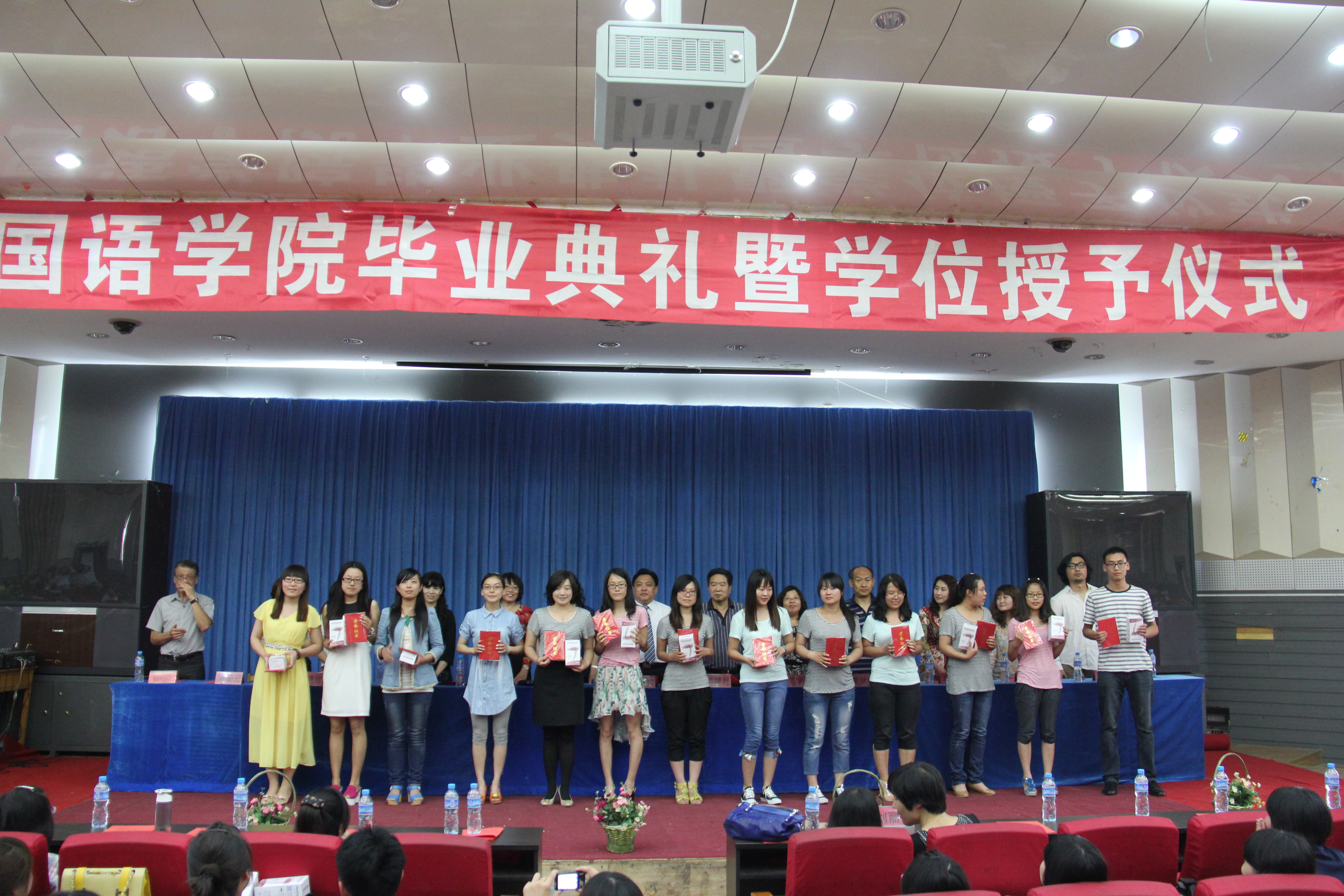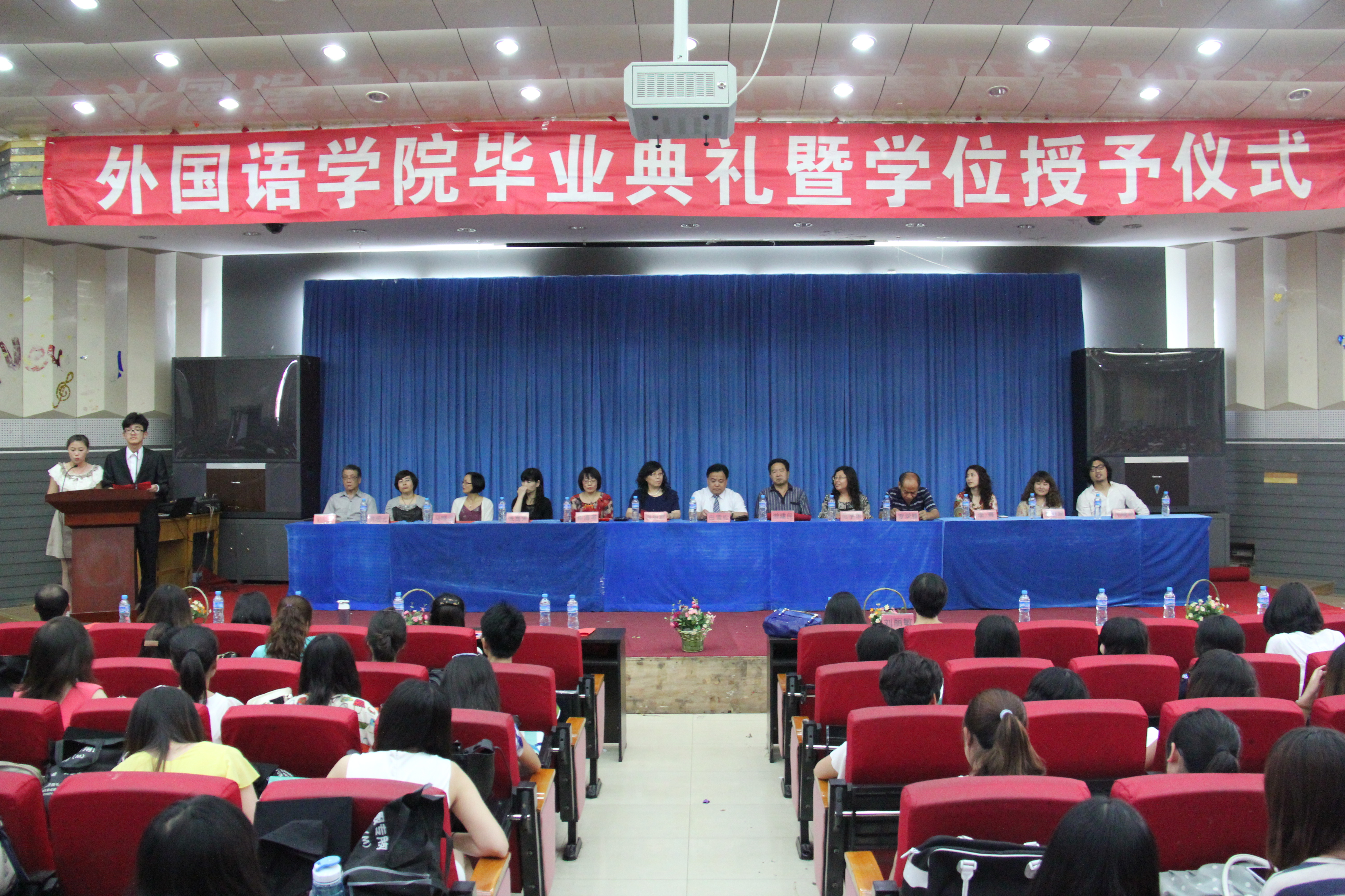 2013年6月19日下午,2013届毕业典礼暨本科生学位授予仪式在开发区学术报告厅隆重举行。外国语公司党委书记白雪松、经理邵丽君、副经理游建民、副经理崔海英以及各教学部主任和全体老师出席大会。即将学成毕业的446名2013届毕业生们满怀激动心情齐聚一堂参加了隆重而庄严的毕业典礼。
