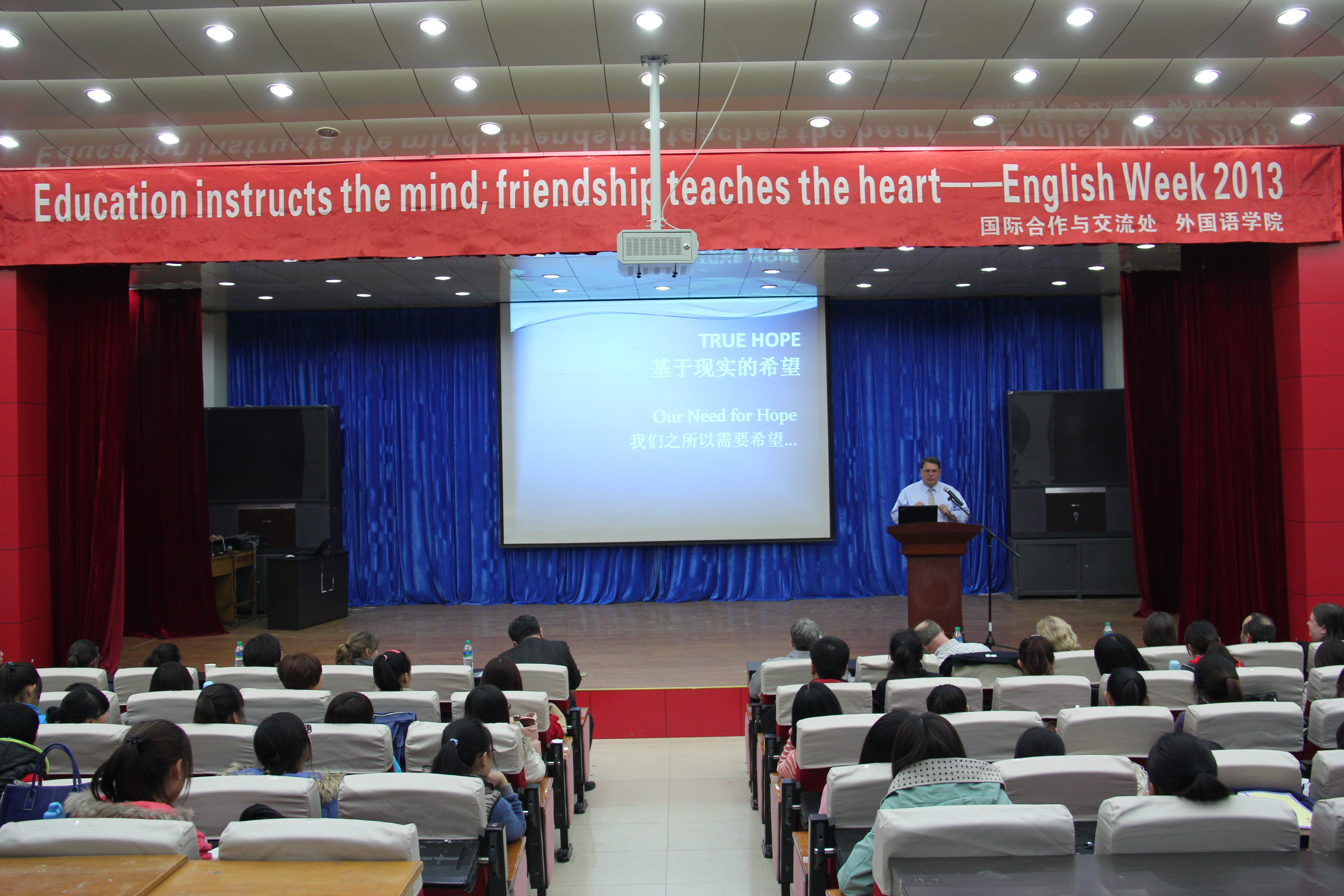 2013年10月25日晚,由公司国际合作与交流处主办,304永利集团承办的“启梦科师2013”系列活动之英语周在开发区校区学术报告厅闭幕。国际合作与交流处、304永利集团相关领导及师生400余人参加了闭幕式。