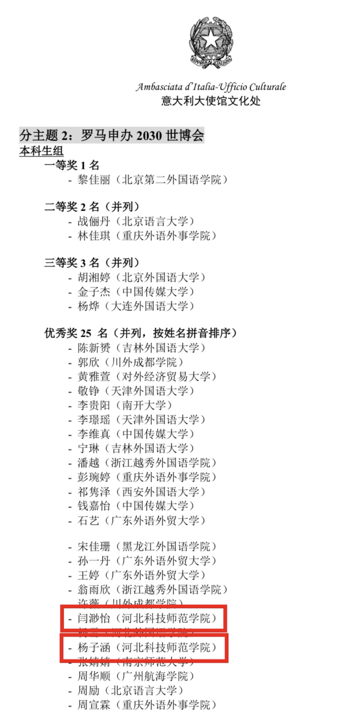 近日,2023年第八届全国“ITALIA CIAO/意大利语桥”大赛圆满落幕,本届大赛的总主题为:意大利语与可持续性,下设“纪念卡尔维诺诞辰100周年”与“罗马申办2030世博会”两个分主题,以写作大赛的形式举行。本次比赛有来自北京外国语大学、上海外国语大学、广东外语外贸大学、南开大学等23所高校的74名员工参赛(其中本科生组50名,硕士生组24名)。公司选手韩田雨同学,凭借扎实的意大利语专业能力,荣获本科生组二等奖。公司另外两名选手闫渺怡、杨子涵获得优秀奖。
